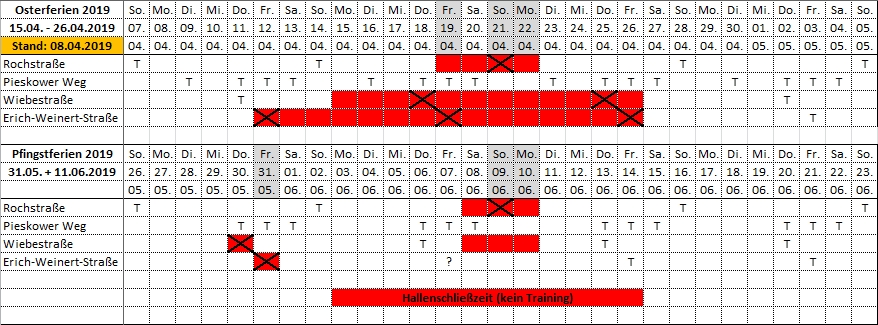 Erich-Weinert-Str. (Einrad): Ist die kompletten Ferien geschlossen, 1. Trainingstag nach den Ferien ist Freitag, 09.08.2019.